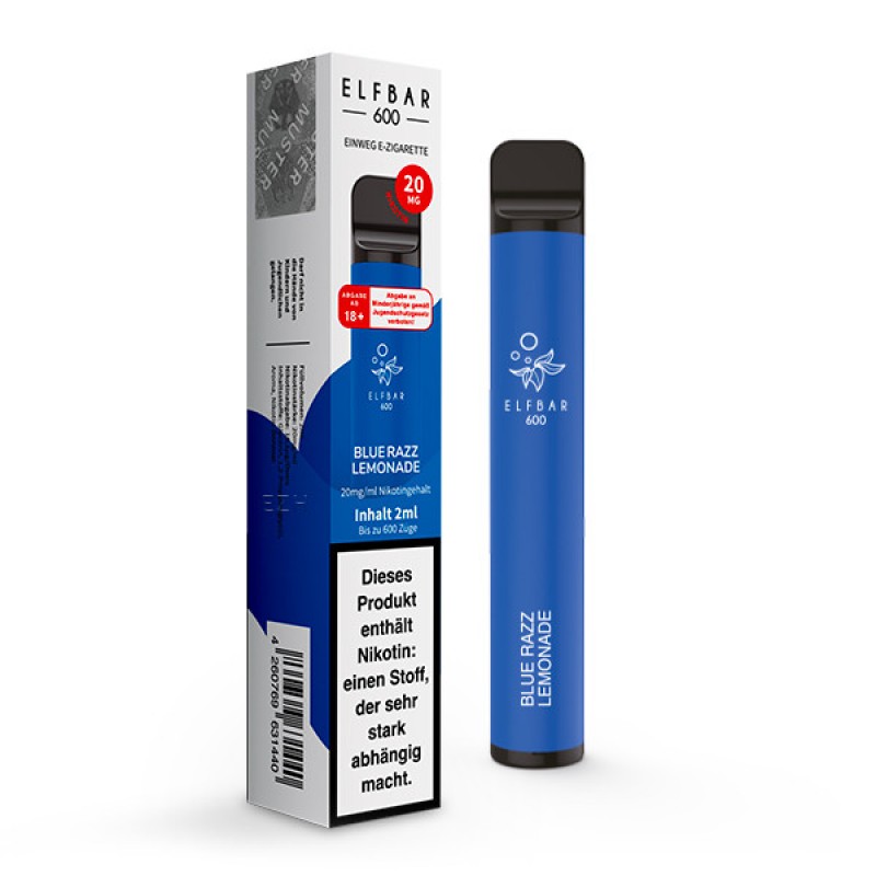 Die ELFBAR® 600 mit dem reifen und fruchtigen Blaue Razz Limonade Geschmack und 20mg Nikotin.