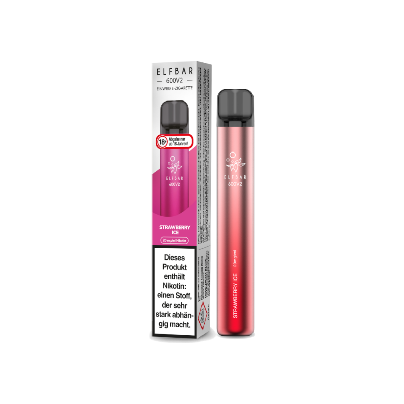 Die ELFBAR 600 V2 Strawberry Ice schmeckt nach süßen Erdbeeren mit Eis. Der Nikotingehalt beträgt 2% (20mg/ml).