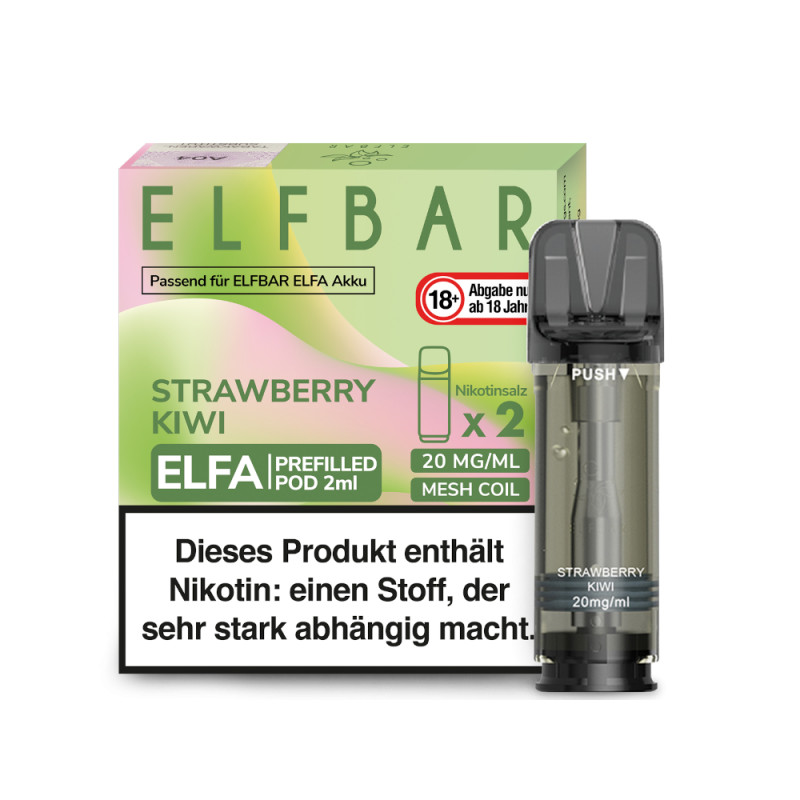 Die Elf Bar ELFA Strawberry Kiwi schmeckt nach einer süßen Erdbeere verfeinert mit Kiwi. Der Nikotingehalt beträgt 2% (20mg/ml).